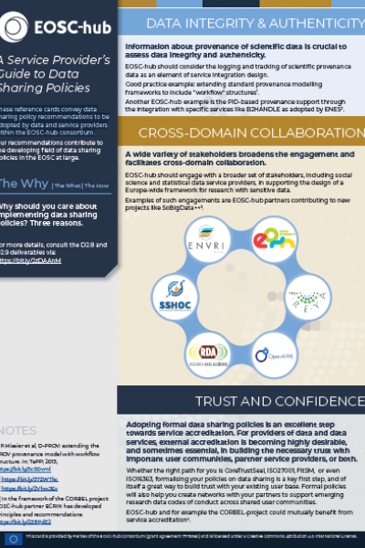 DOWNLOADThese reference cards convey data sharing policy recommendations to be adopted by data and service providers within the EOSC-hub consortium.