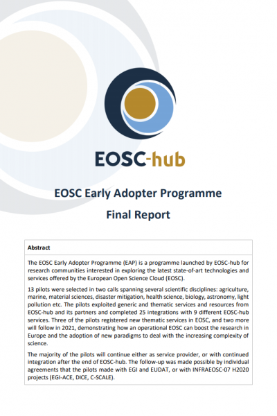 DOWNLOADThe EOSC Early Adopter Programme (EAP) is a programme launched by EOSC-hub for research communities interested in exploring the latest state-of-art technologies and services offered by the European Open Science Cloud (EOSC).