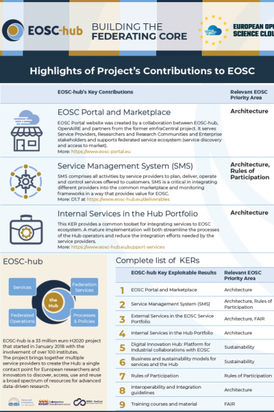 The EOSC hub project aims to create a hub of service providers to accelerate data-driven research in Europe. Nine Key Exploitable Results (KER) have been produced to support this goal and they are described in this presentation.